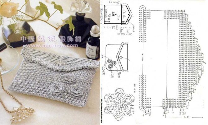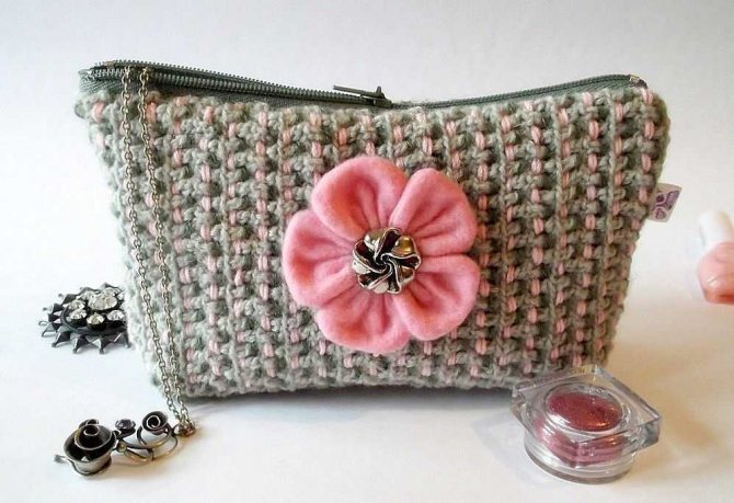 Косметичка готова, можно ее украсить готовыми декоративными элементами, как в предыдущем случае, а можно связать и пришить украшение в виде цветка, как, к примеру, на следующей схеме: