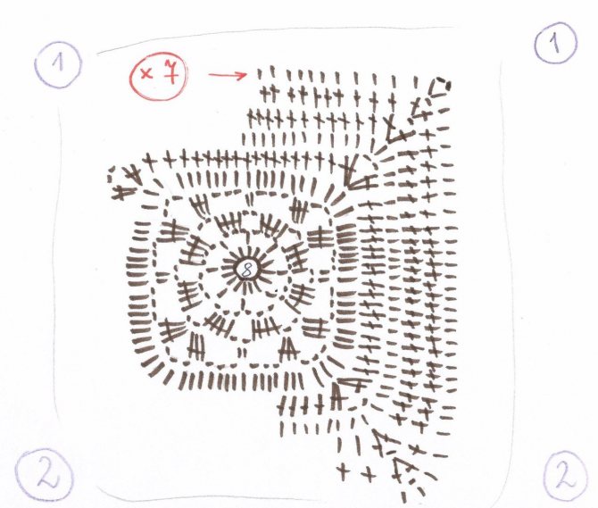 Остановимся подробнее на схеме вязания. Хитрость её состоит в том, что нижние (1) и верхние (2) углы выполняются по-разному. Отсутствие столбиков в нижних углах делает косметичку объёмной. За счёт появившегося объёма у косметички будет донышко.