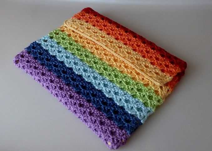 Следующее изделие исполняется чуть сложнее, но результат стоит того. Разноцветная косметичка радует глаз, кроме того, один из плюсов её вязания – использование остатков пряжи.