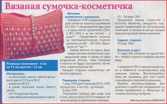 Давайте рассмотрим несколько моделей косметичек: начиная от простого варианта для начинающих до более сложного, где используются разные виды столбиков. Разобраться с тонкостями исполнения помогут предлагаемый мастер класс и видео советы.