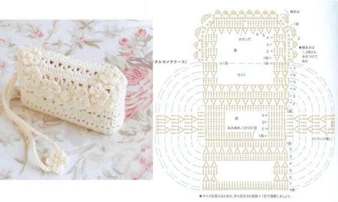 Следует обратить внимание, что провязывание полотна по схеме идет не по всем петлям, ведь необходимо получить плетение, которое складывается в готовую косметичку.
