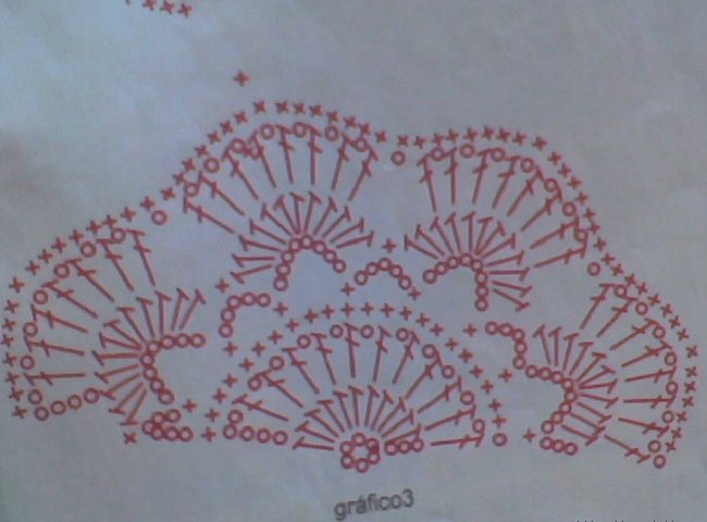 4. Меняем цвет пряжи на розовый. Провязываем ряд таким образом: 3 в.п. подъема, *столбик с накидом со смещением влево на одну петлю, еще 2 столбика с накидом. Последний столбик с 1 накидом провязываем с основанием в первую, ранее пропущенную петельку предыдущего ряда (см. схему)*. Повторить от * до * до конца ряда.