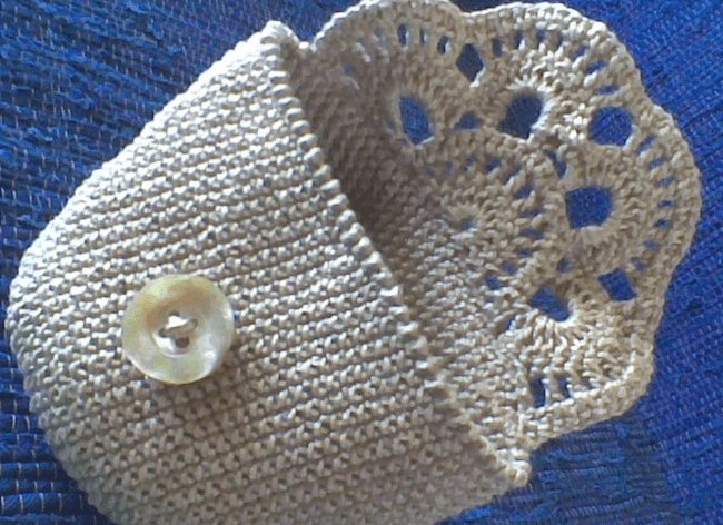 Для вязания берут тонкую хлопковую пряжу и соответствующий толщине пряжи крючок. Украшается готовый аксессуар бисером.