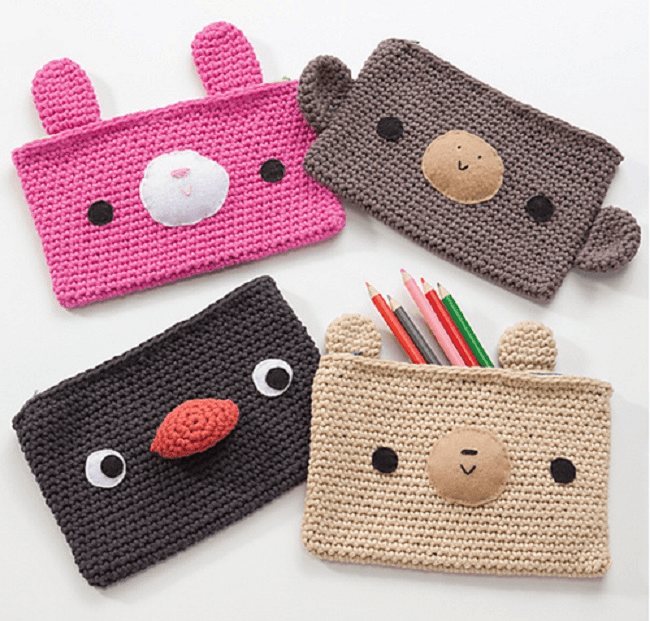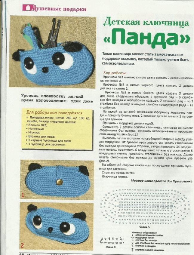 Девочке понравится оригинальный пенал, связанный крючком. Но, еще лучше подарить ей сумочку в виде любимого зверька, например, панды. Чтобы маме было легко справиться с таким заданием, на помощь придет картинка с подробным описанием работы, перечнем необходимых материалов и схемы вязания. Оттенки пряжи и украшения меняйте в зависимости от желания ребенка или возможностей рукодельницы. В любом случае, эта сумочка станет любимой вещью дочурки.