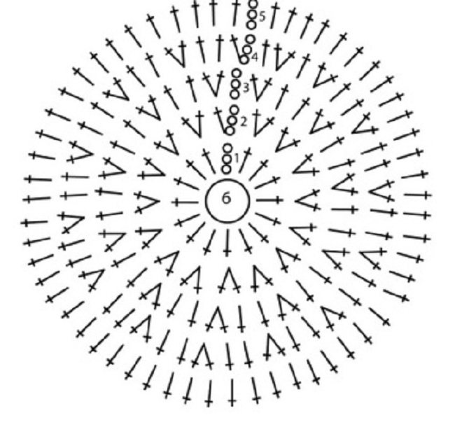 Для этого 6 воздушных петель соединяем соответственным столбиком в подобие круга. Далее провязываем круговыми рядами, придерживаясь схемы, провязывая каждую первую петлю кругового ряда воздушной, заканчивать соединительным столбиком в последнюю воздушную петлю начала. Так повторять с первого по семнадцатый круговые ряды.