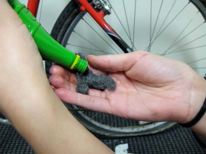 - Потереть материалом для шлифовки с нанесенной жидкостью по поверхности велосипеда. Тщательно пройдитесь по всем местам, не забывая о креплениях и других мелких элементах.