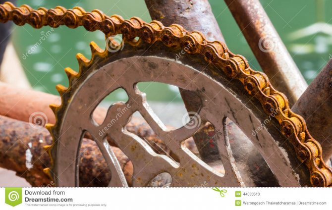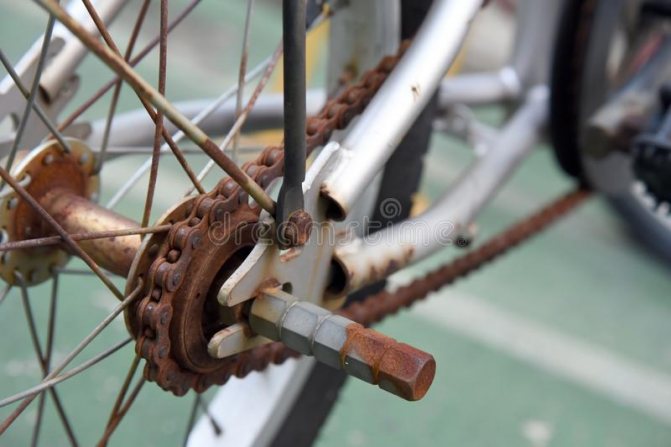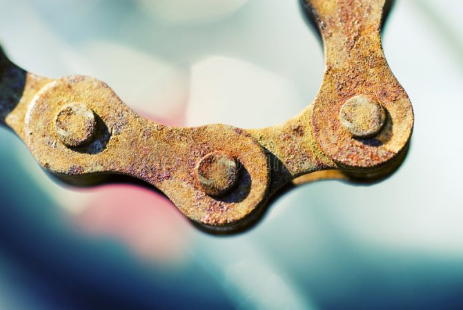 Эту часть велосипеда нельзя красить или чистить металлической щеткой, так как она быстро придет в непригодное состояние. Для устранения ржавчины с велосипедной цепи нужно действовать следующим образом: