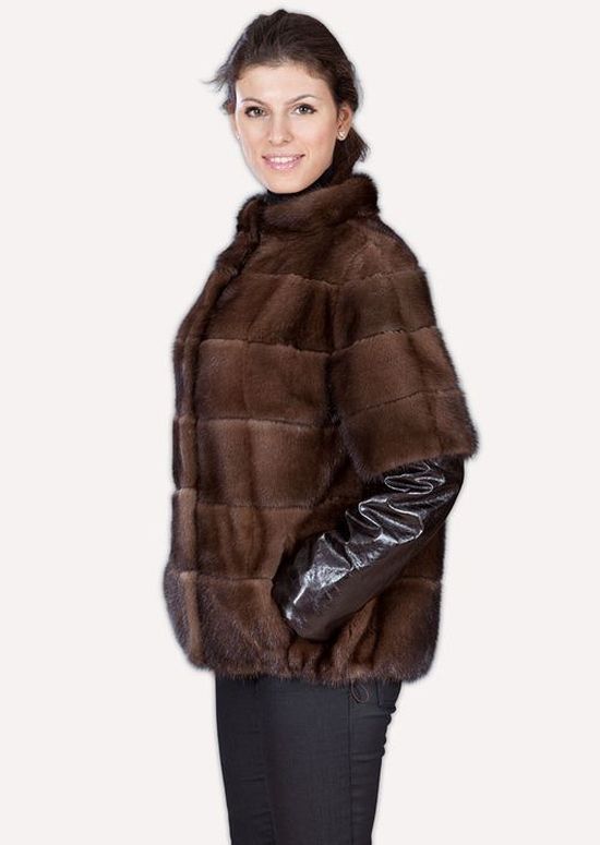 - Шубка с кожаными рукавами. Принцип пошива такого изделия схож с предыдущим. Предварительно следует отпороть рукава из пушнины и сделать новые элементы из кожи. После этого элементы сшиваются в единый полушубок.
