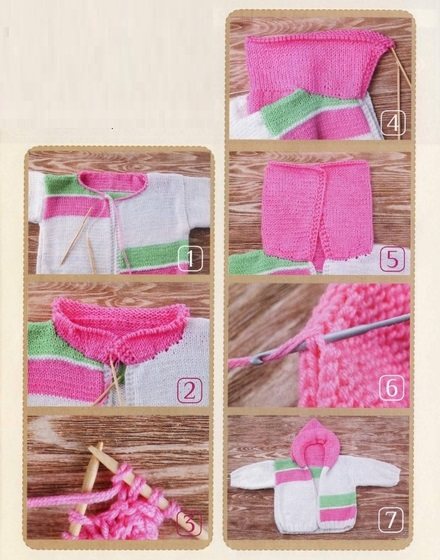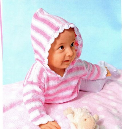 Детская одежда с капюшоном очень практична. В случае внезапного похолодания или осадков всегда можно быстро прикрыть голову малыша. На фото внизу показаны варианты вязаных изделий с капюшоном для детишек.