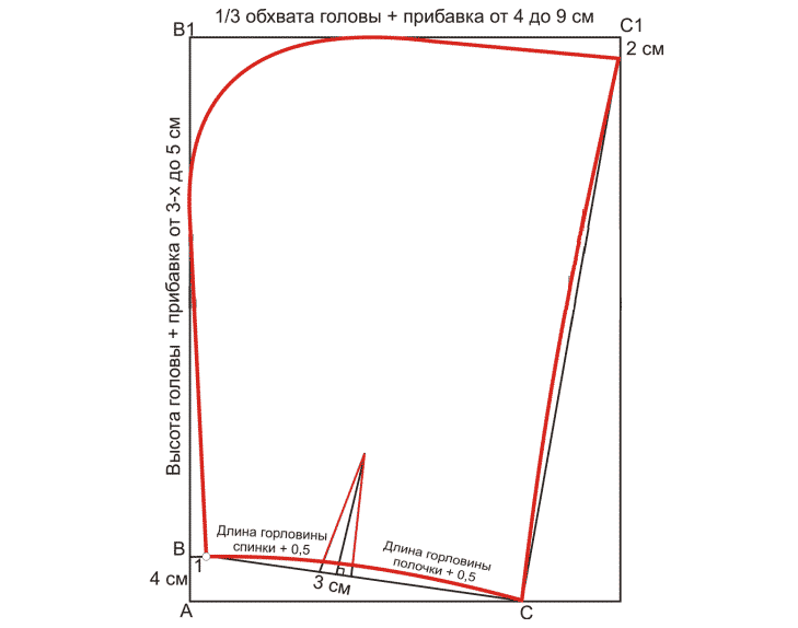 - От точки В1 вправо добавить треть обхвата головы и прибавить 4-7 см.