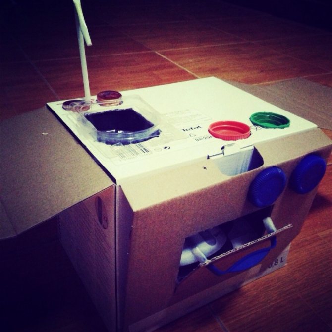 Достаточно просто раздобыть коробку нужного размера, маркеры, клей и цветной картон с фломастерами. Очень популярны домики для кукол, кухонная мебель, стиральные машины, телевизоры.
