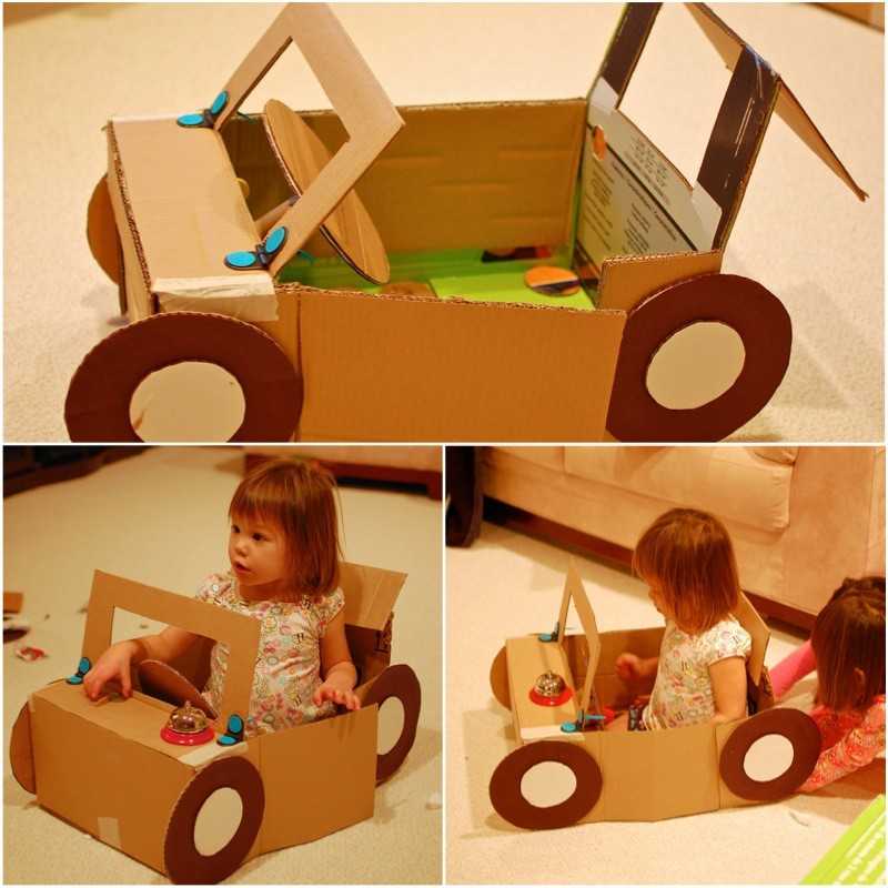 Следуя пошаговому изготовлению поделок из коробок, нетрудно смастерить машину для ребенка.