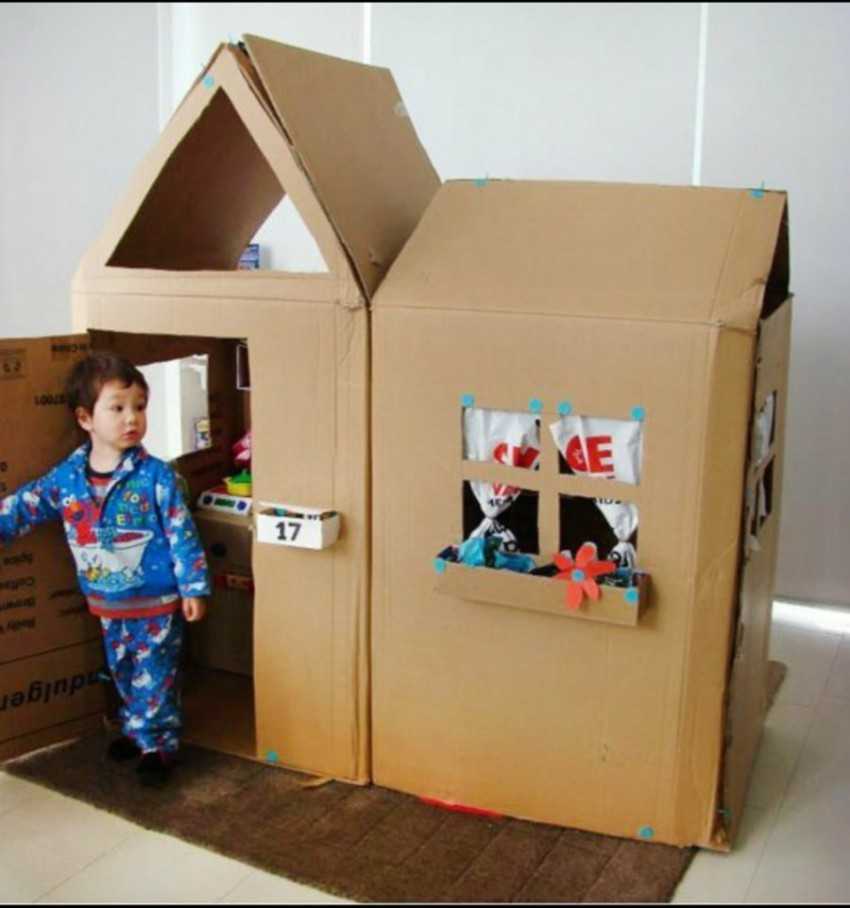 Самый простой для начинания вариант — поделка домик из картонных коробок. Для начала нужно рассчитать размер. Он зависит от конечного использования, будет ли это домик для маленькой игрушки или для куклы, а может быть, сам ребенок захочет пожить в таком миниатюрном домике.