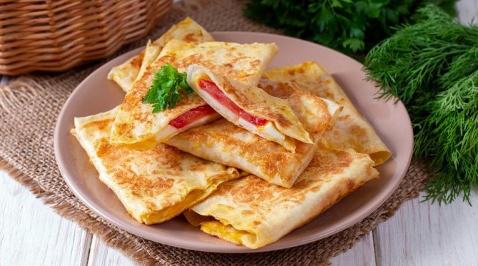 Второй вариант с лавашом, который я очень часто использую, если у меня после какого-нибудь мероприятия остается сырная нарезка. Берем все сыры, слегка их рубим, складываем в середину лаваша и делаем конвертик. Либо на сухой сковородке, либо с добавлением небольшого количества топленого масла обжариваем с обеих сторон. Получается, скажем так, хрустящий хачапури из лаваша с сыром внутри — тоже очень вкусно.