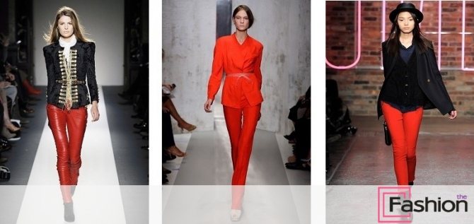 Если на улице прохладно, то ансамбль с красными штанами всегда можно дополнить кожаной косухой, курткой из денима или тренчем любого бежевого оттенка. Завершить комплект помогут ботильоны или ботинки бежевого, серого или черного цвета в зависимости от расцветки верхней одежды.