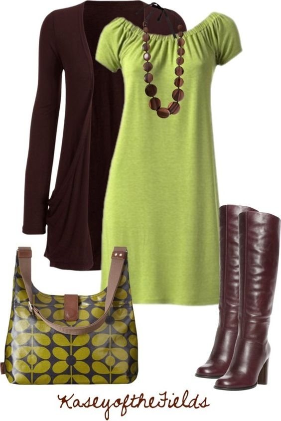 Комбинирование зелёных и коричневых оттенков являются привычными даже в природе. В создании нарядов с такой цветовой палитрой нет никаких ограничений – творите, так как хотите, такой подход будет самым успешным. А для тех, кто предпочитает стиль кэжуал, просторы расширяются ещё больше. Одежда с этническими принтами в самый раз подойдёт к сапожкам коричневого цвета. Как обычно рассмотрим, фото с чем носить коричневые сапоги.