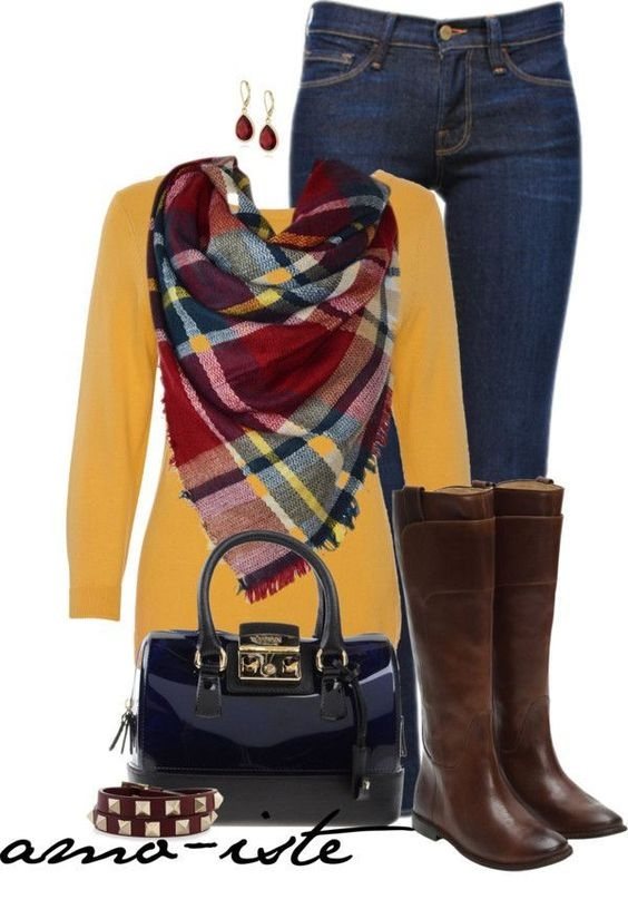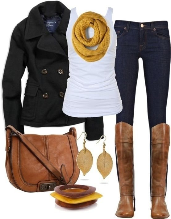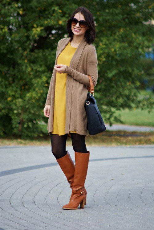 В создании наряда с участием вещей жёлтого оттенка и сапогами коричневого, достаточно знать единственное кредо и это — сочетать тёмные оттенки коричневых сапог со светлыми (например, жёлтыми) оттенками одежды и наоборот.