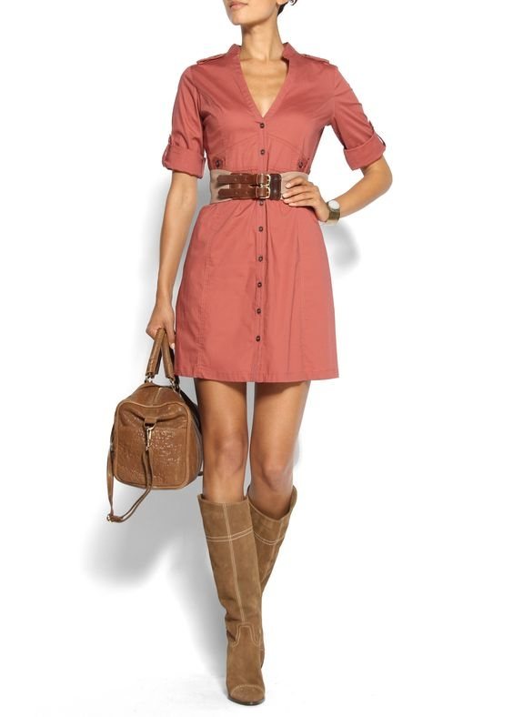 В комбинации с коричневыми сапогами, нежно-розовый оттенок теряет ошибочное мнение насчёт цвета кукольных платьев и тому подобное. В паре с коричневым такой цвет приобретает особую элегантность и мягкость.