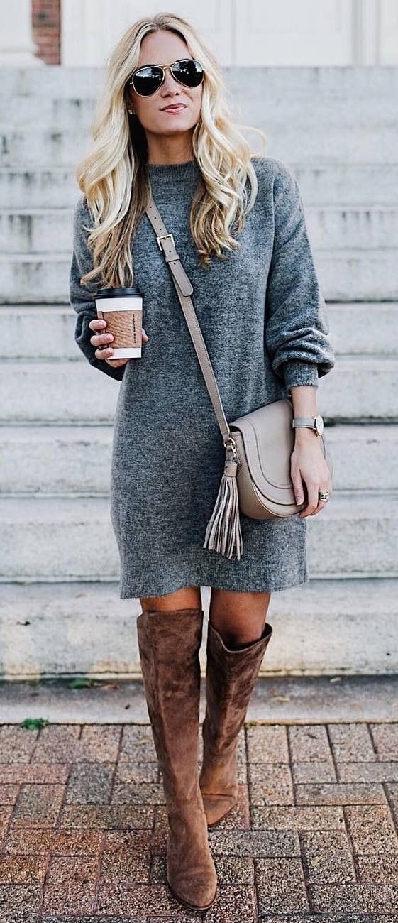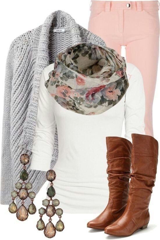 ерый отлично смотрится с бордовым, баклажановым, темно-зеленым, серым, черным. Поэтому эти цвета в разных воплощениях могут появляться в ваших луках. Например, это могут быть баклажановые брюки и серый кардиган или зеленая юбка-карандаш и светло-серый джемпер и т.д. Серые сапоги на каблуке подойдут и к строгому синему платью длины миди. Другие вариации на эту тему предлагаем посмотреть на фото:
