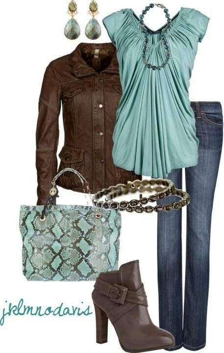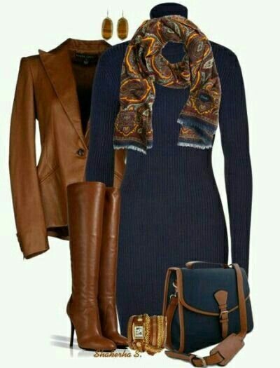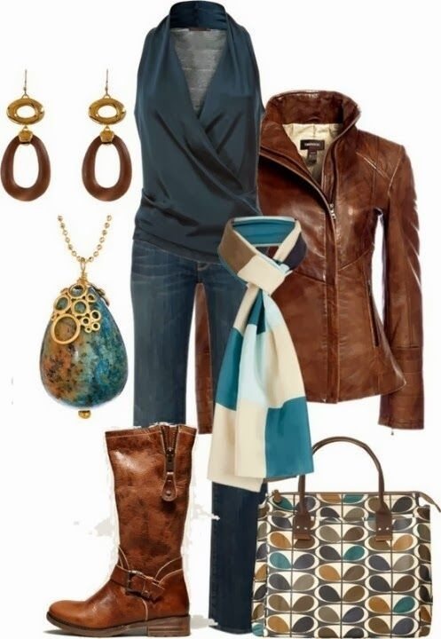 — очень впечатляет, особенно если остальная одежда и аксессуары подобраны в соответствующих оттенках. Простой пример: узкие джинсы или джинсовая юбка, платок голубого неба (или платок с коричневым и синим рисунком), кожаная сумка и кожаная куртка в тон.