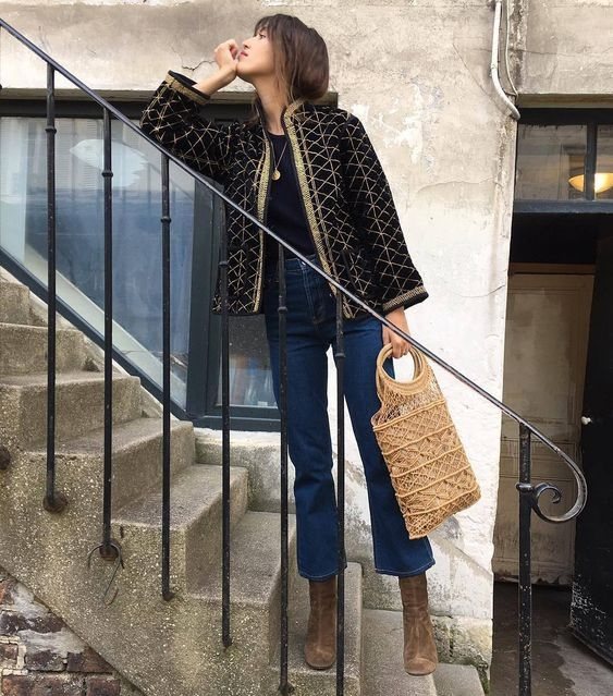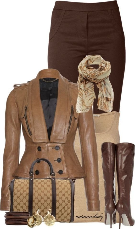 Для комбинирования этих вещей нужно всего лишь выбирать куртку из кожи и сапоги в одном цвете (ну или хотя бы приближённо), а остальные декоративные элементы и вещи выбирать одинаковыми между собой оттенками. К примеру, наденьте синие джинсы, коричневую кожаную курточку, сапоги того же цвета и украсьте это всё шарфиком. Сумочку тоже можно взять из кожзаменителя коричневого оттенка.