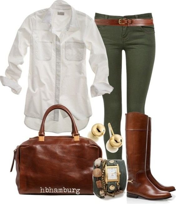 Классические коричневые кожаные сапоги требуют кожаной сумки среднего размера и классической формы, ежедневные варианты позволяют экспериментировать с кроем и размерами и сложными цветовыми сочетаниями одежды, требуя творческого подхода к выбору аксессуаров.