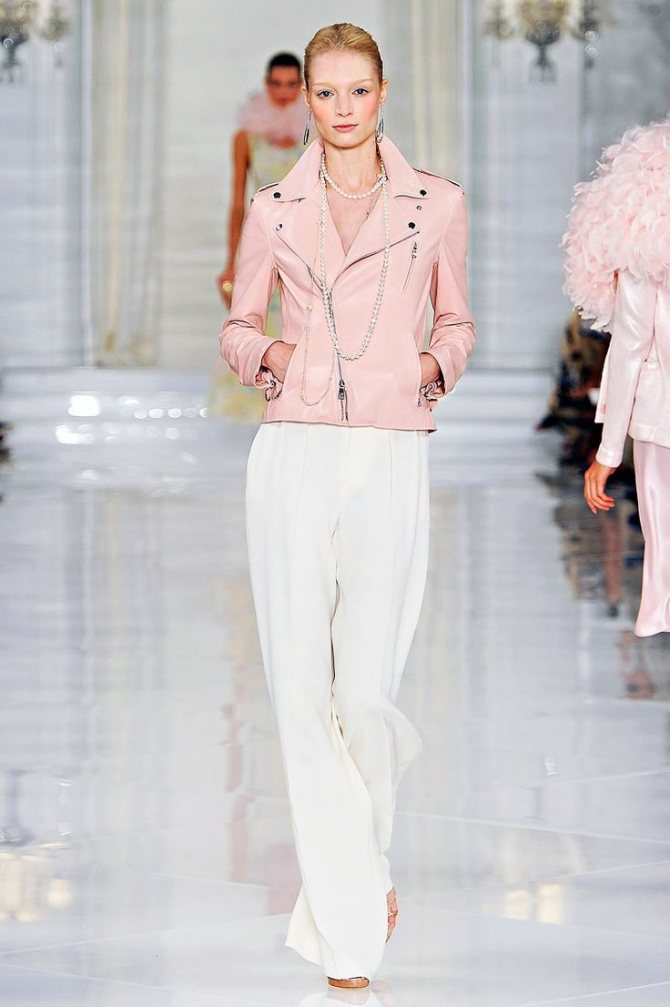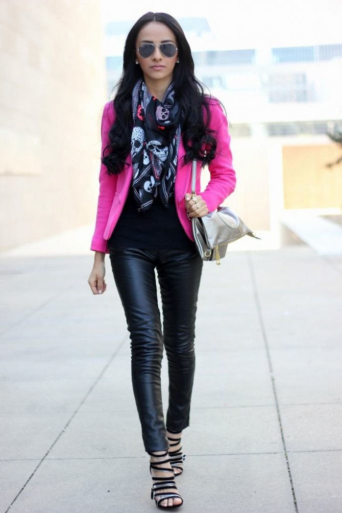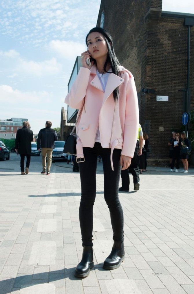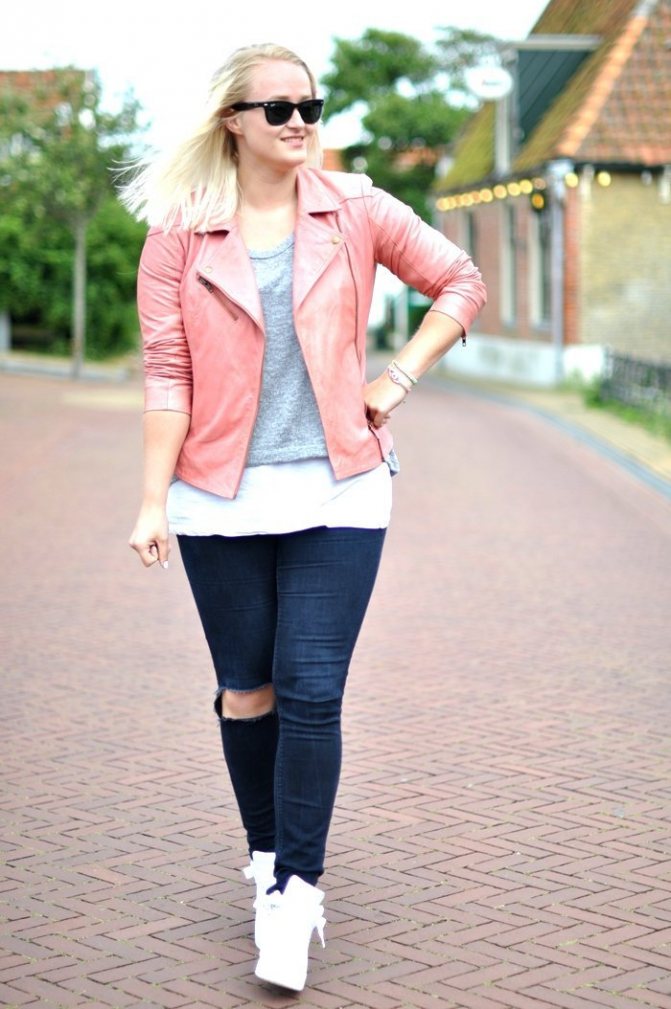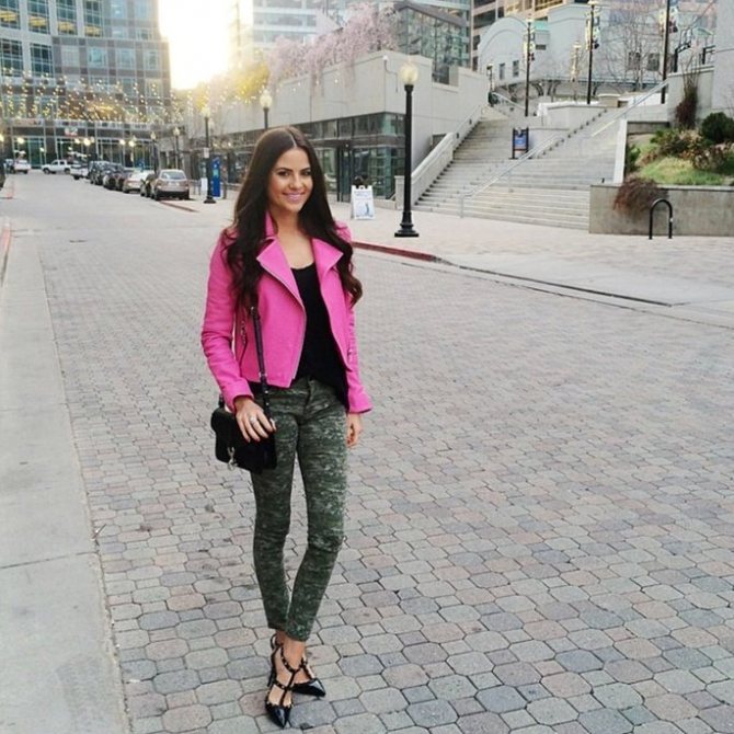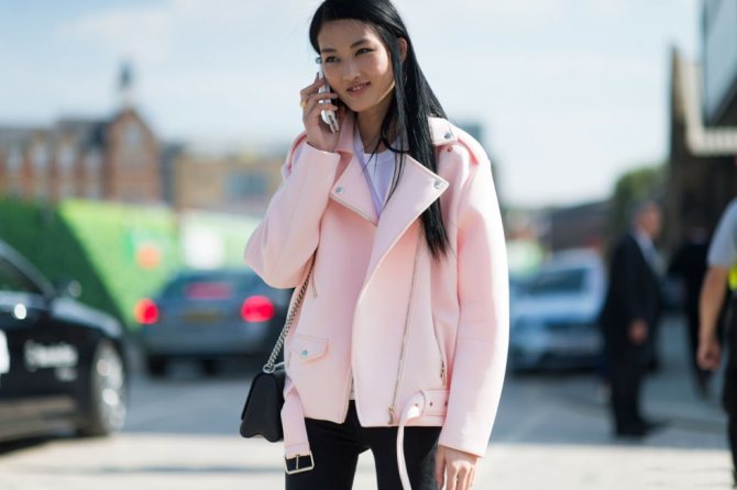 Обратите внимание на розовую кожаную куртку. Ее легко можно совмещать с одеждой разных стилей