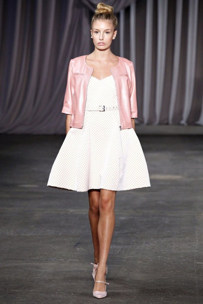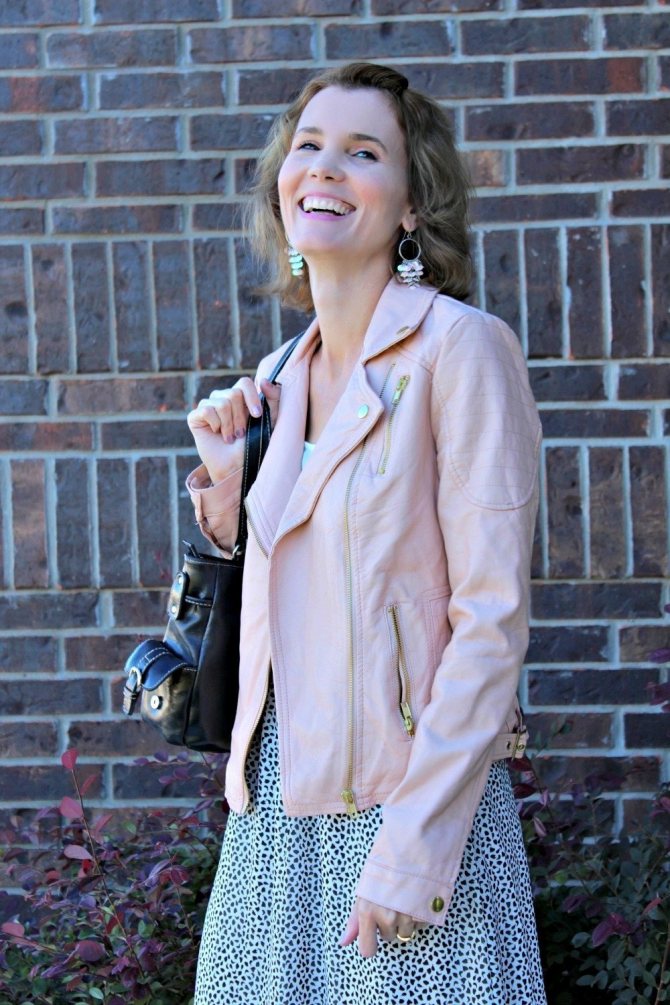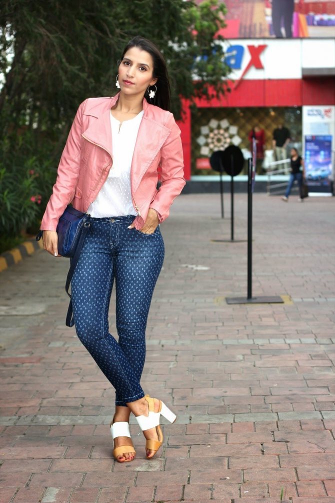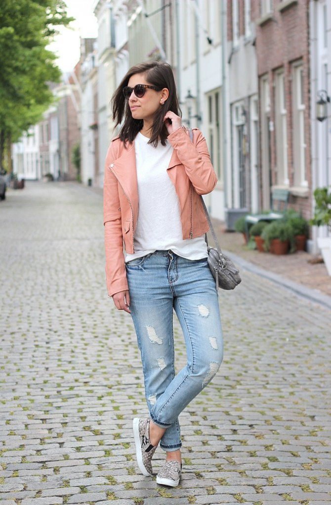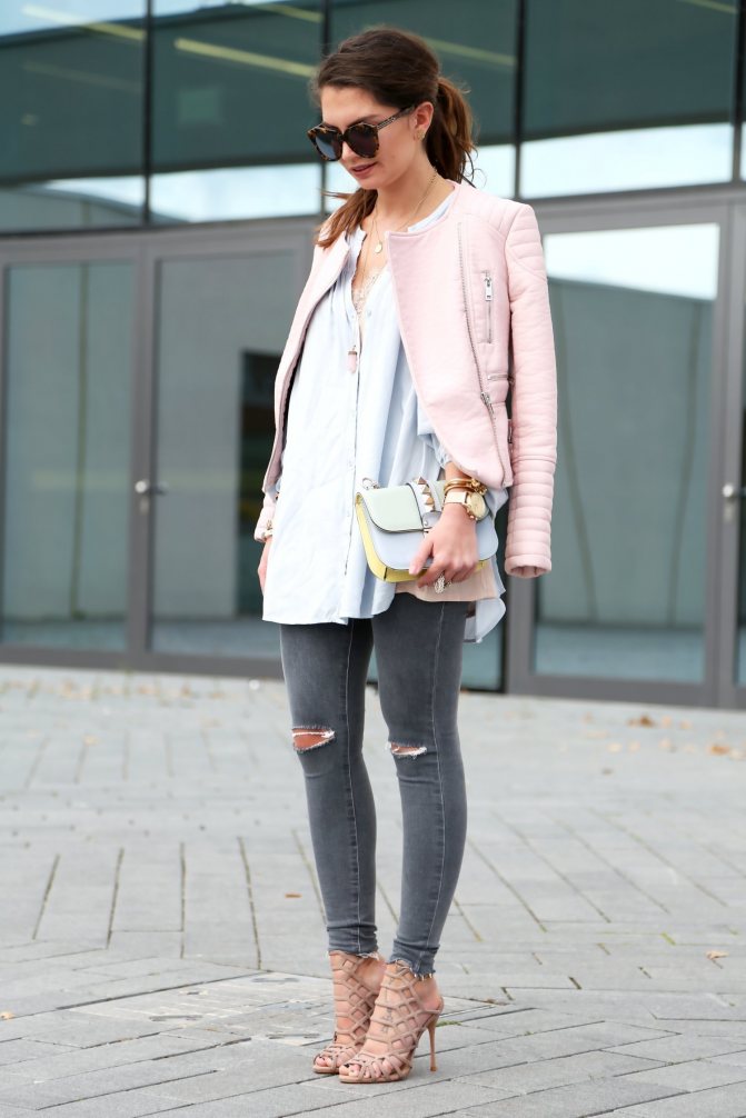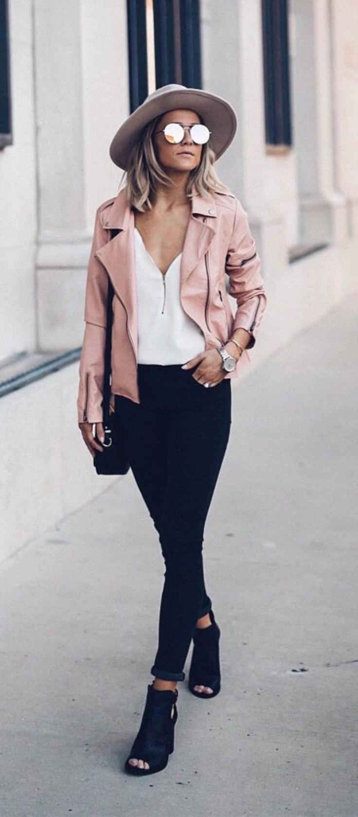 Обратите внимание на розовую кожаную куртку. Ее легко можно совмещать с одеждой разных стилей