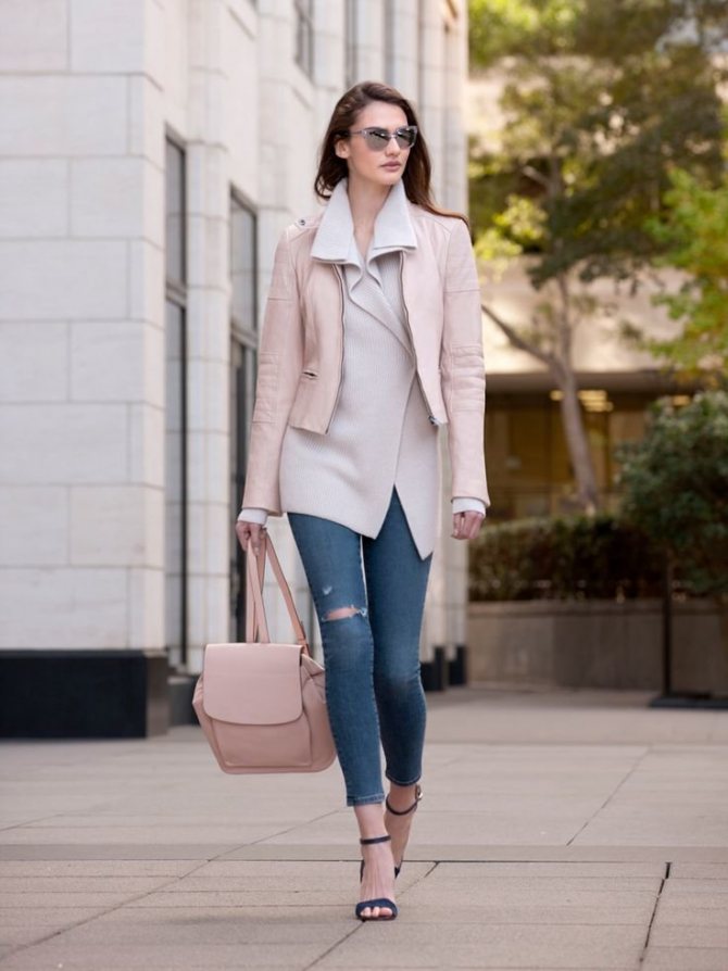 Кожаная розовая куртка классического покроя гармонично сочетается с любым низом. Это могут быть брюки, джинсы, юбки и платья разные по длине