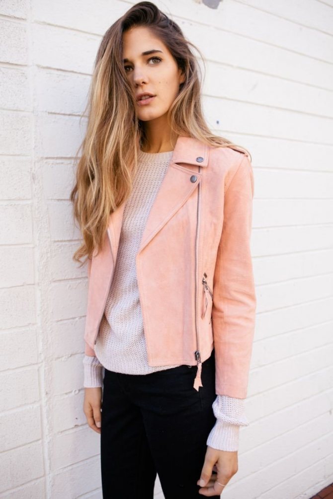 Классикой остается кожаная куртка косуха. В розовом цвете она смотрится особенно привлекательно