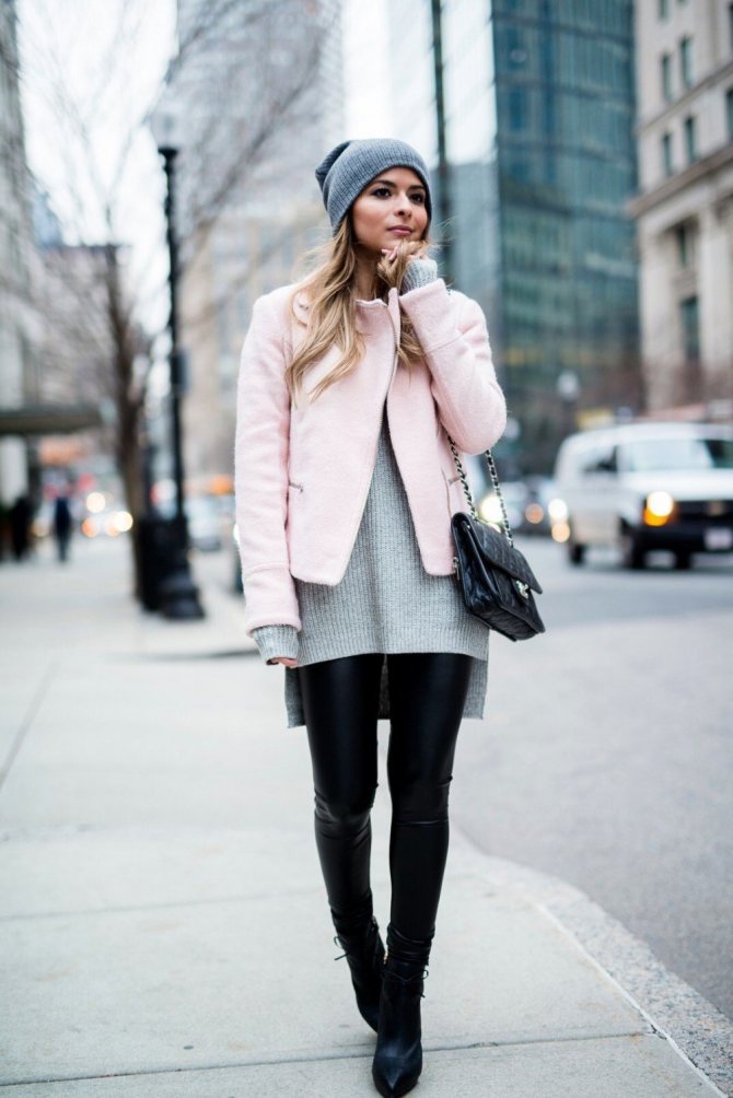 - На каждый день. Короткий верх, водолазка, джинсы скинни или леггинсы, удобная обувь на низком ходу – лучший комплект для прогулок, похода по магазинам. Светло-розовое пальто миди эффектно смотрится с денимом за счет легкого контраста теплого цвета с голубым. Такое сочетание предпочитают Ким Кардашьян, Джиджи Хадид, Джессика Альба.