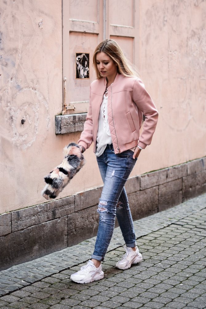 В первую очередь обратите внимание на сезонность обуви. Если у вас летняя розовая куртка, превосходно подойдут балетки. Спортивную модель дополнят кроссовки, слипоны, мокасины темных или светлых тонов. Сникерсы укажут на разносторонность личности.