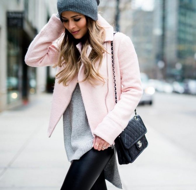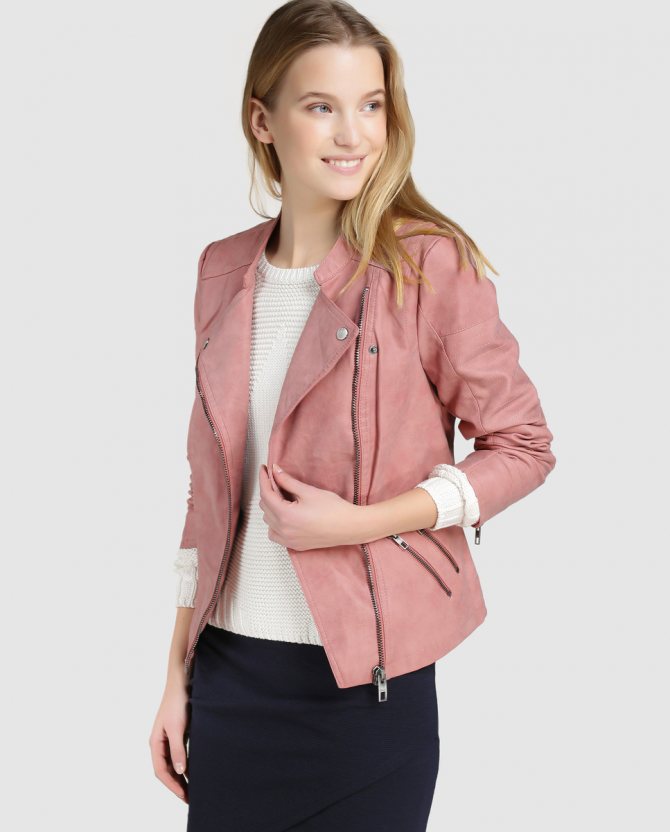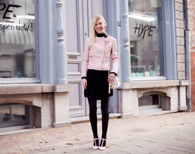 - Кожаная розовая куртка спортивного покроя подходит под спортивные зауженные штаны, леггинсы, джеггинсы, джинсы. Если модель не расклешенная, под нее можно надеть короткую юбку.