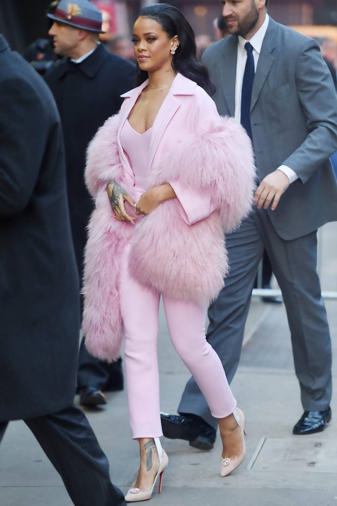- Нарядные образы. Один из самых нарядных образов – однотонный наряд, что демонстрируют голливудские звезды Рианна, Блейк, Лайвли, Дженнифер Лопес. Знаменитости появляются на красных дорожках в пальто оттенка розового кварца, надетом поверх брючного костюма или платья в тон. Эффектно смотрится верх цвета фуксии А-силуэта до середины голени с бордовыми сапогами, сумкой, платьем.