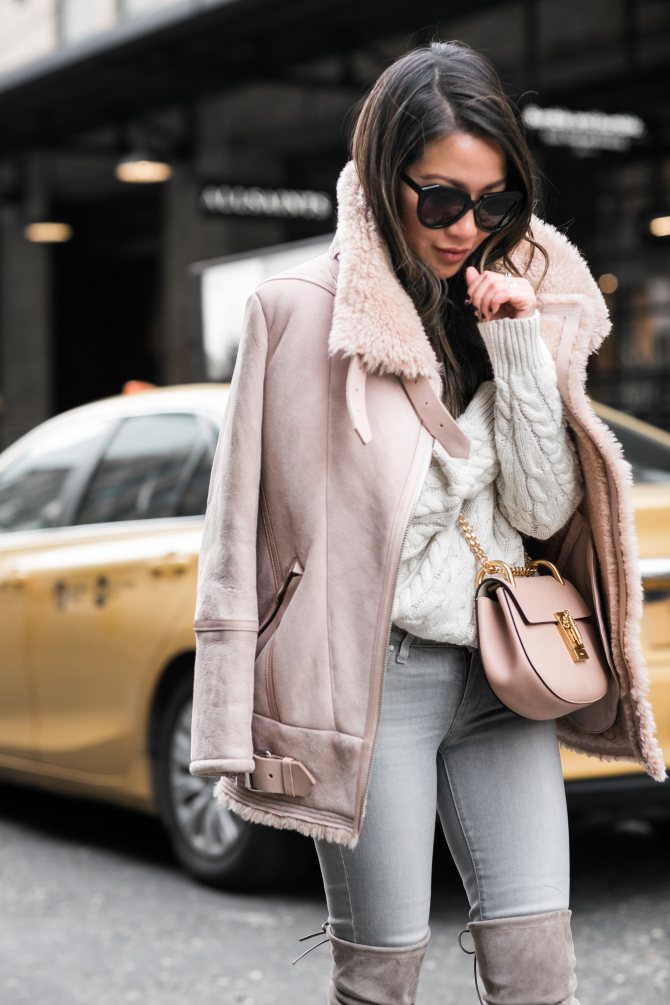 - Более тёплый вариант. Серые джинсы, пояс, тёплый белый джемпер. Идеально сочетается с розовой дублёнкой. В качестве аксессуаров чёрная сумка, ремень и множество цепочек.