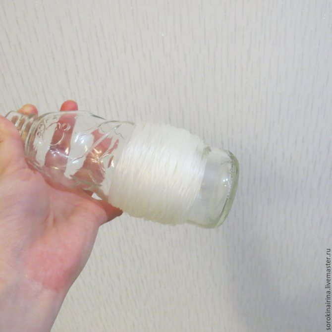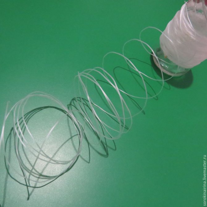 Как готовим леску? Будем ее варить, предварительно намотав на основу нужного диаметра. Я взяла бутылочку из-под детского сока, намотала на нее примерно половину упаковки лески, закрепила ее тонкой ниткой, положила в кастрюлю с водой, поставила на плиту, довела до кипения и убавила огонь до минимального.