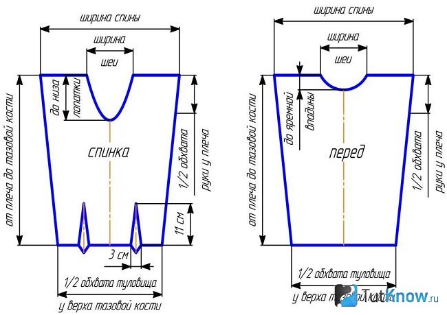 Как вы видите, полученные измерения нужно отложить на выкройку. На спинке заложите две складки шириной 3 см.