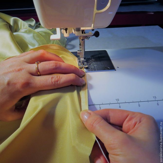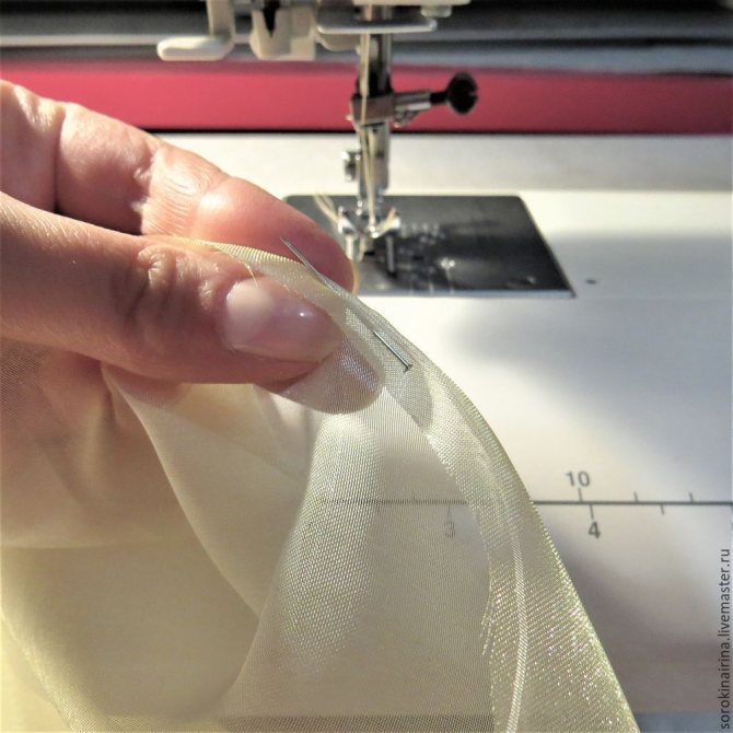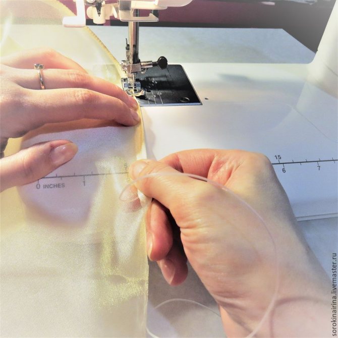 Кончик лески оборачиваем краешком подола, закрепляем булавочкой, чтоб не убегал, пока мы подсовываем ткань под лапку. И начинаем строчиь зигзагом по всей окружности юбки.