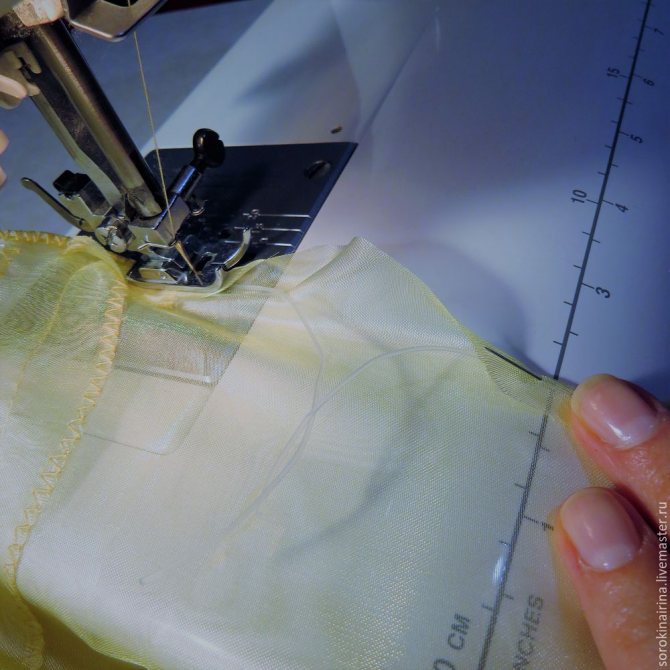 Этап: обработка края. Для фатина можно использовать простой зигзаг и сделать хороший шов по краю, так фатин ляжет аккуратной волной. Другие детали обрабатывают на специальном оверлоке, так как часто ткань эластана хорошо распускается и даёт неприятные стрелочки.