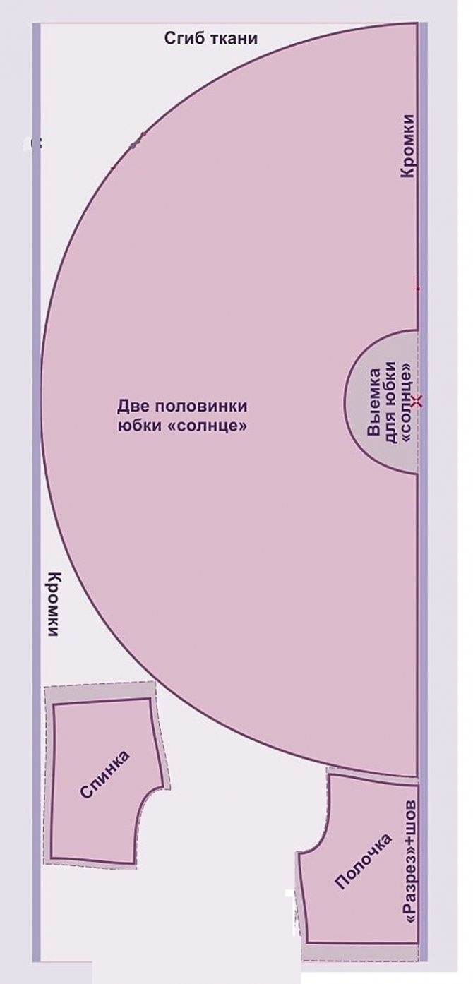 Этап: мерки. Самый быстрый способ сшить такое платье — это использовать водолазку. Просто приложить её к эластической ткани и обвести. Как на выкройке сделать рукав и полочки. Не придётся оставлять припуски для швов, так как ткань хорошо тянется и будет приталена. Для выкройки подола нужно будет начертить на эластической ткани полусолнце и тут не обойтись без некоторых мерок, которые отмечены на самой детали выкройки. Это длина и её довольно просто на этом этапе регулировать и окружность талии. Из фатина выкроить аналогичную деталь подола.