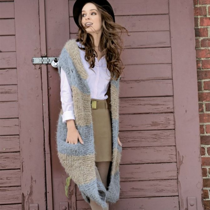Такой жилет будет выглядеть особенно красиво, если выполнить его из натуральной кашемировой пряжи. Так как модель не имеет швов, она может по желанию легко трансформироваться в теплый объемный шарф.