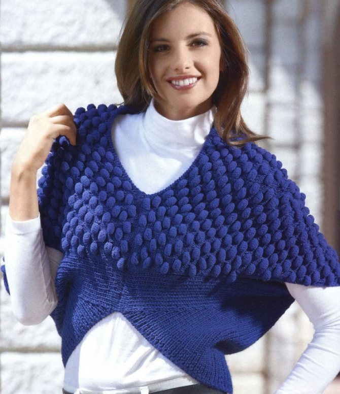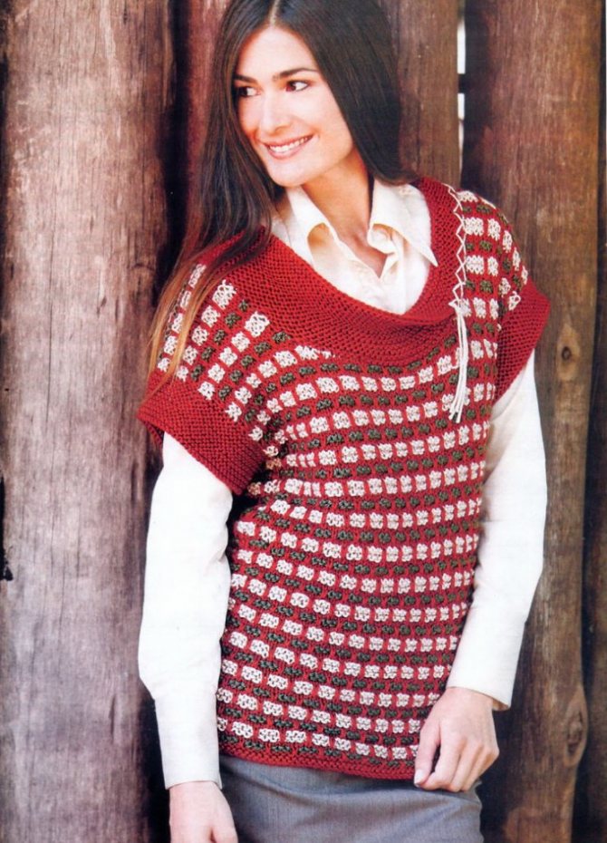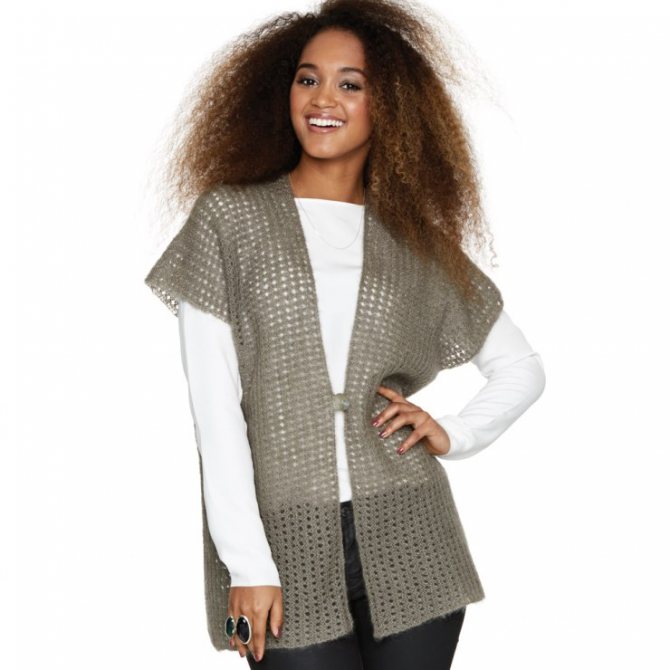 Он успешно дополнит ансамбль в классическом стиле или стиле кэжуал, а, украсив его нарядной брошью, добавишь образу элегантности. Эту безрукавку вяжут спицами, а носить ее можно 2 способами. Цвета пряжи, конечно, можешь выбрать на свой вкус.