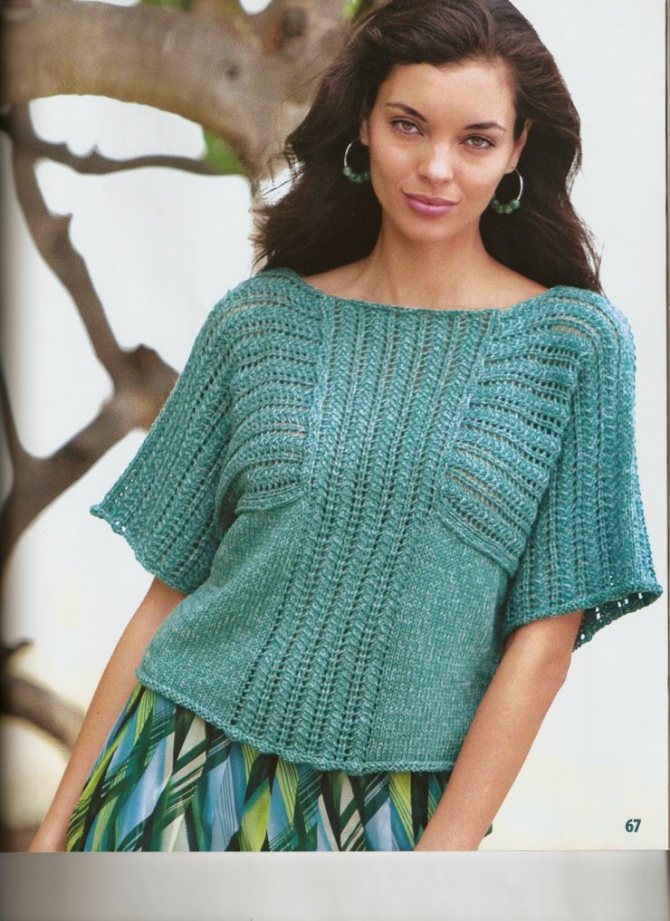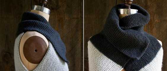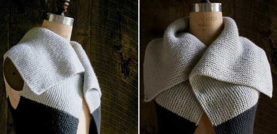 Еще одна модель также вяжется очень просто. Для работы вам потребуется пряжа из хлопка и полиэстра любого цвета, который вам нравится, а также спицы под номером восемь. Платочная вязка выполняется следующим образом: в изн. и лиц. рядах следует вязать только лиц. петли. Вязаная плотность изделия составляет 15 п. на 28 р. равное 10 на 10 см.