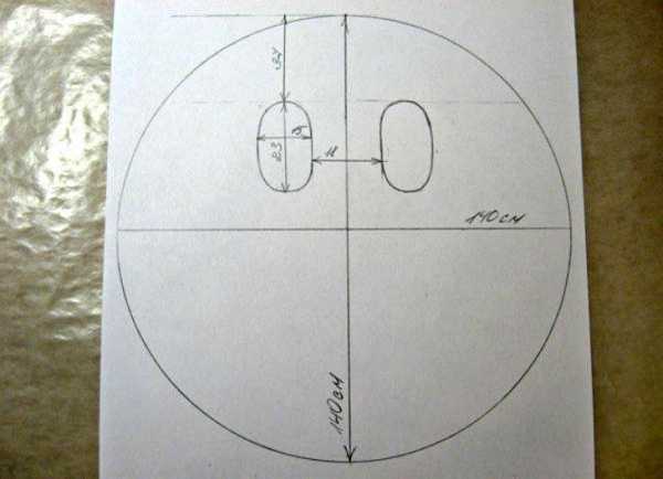 Делим круг на 4 части и, как показано на рисунке, чертим проймы на расстоянии 46−50 см.