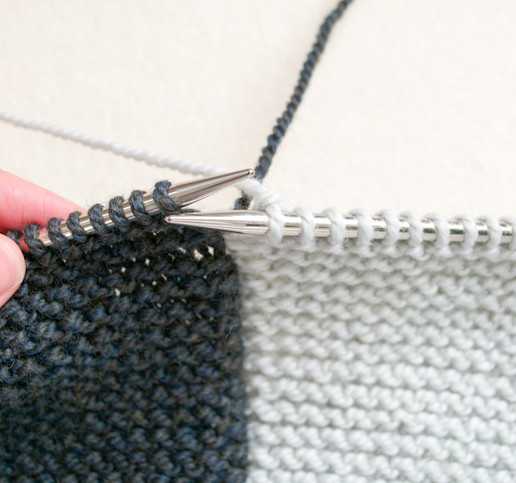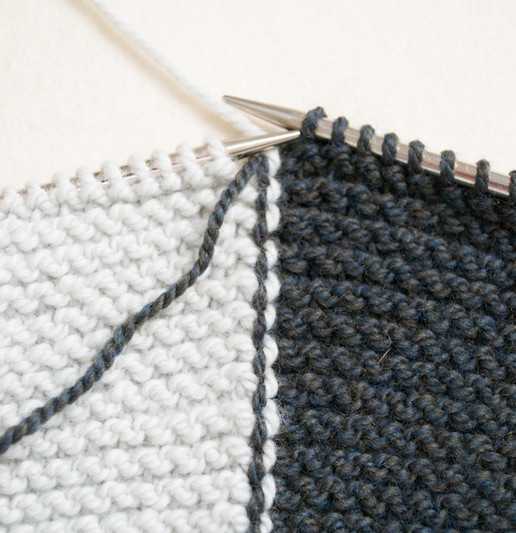 После окончания вязания прямоугольника петли, собранные контрастной нитью переносим на круговые спицы, оформляем проймы, а нитку удаляем. Таким образом, у нас получается аккуратный край.